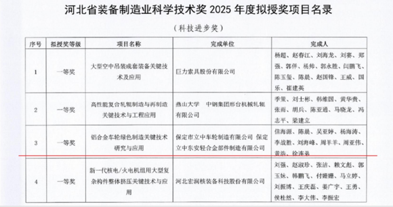 立中車輪集團項目獲2025年度河北省裝備制造業(yè)科學(xué)技術(shù)獎一等獎